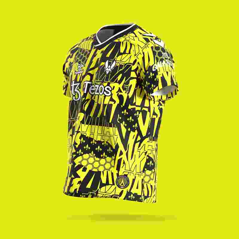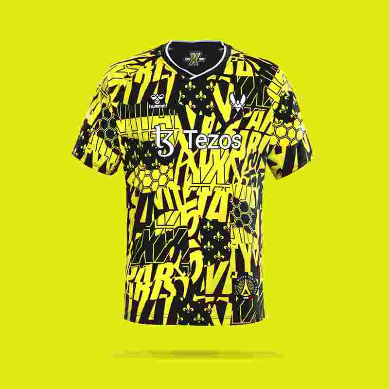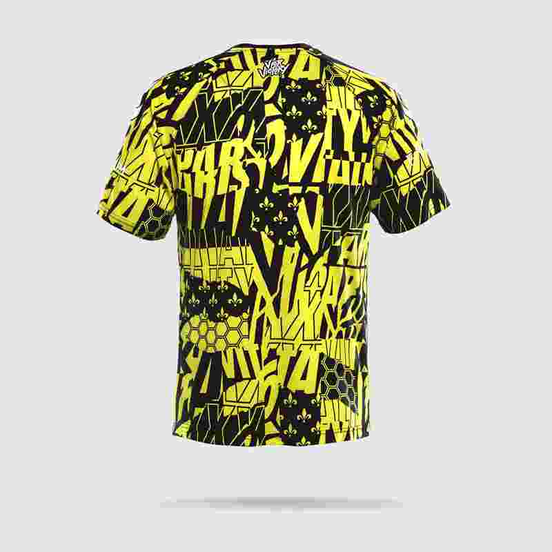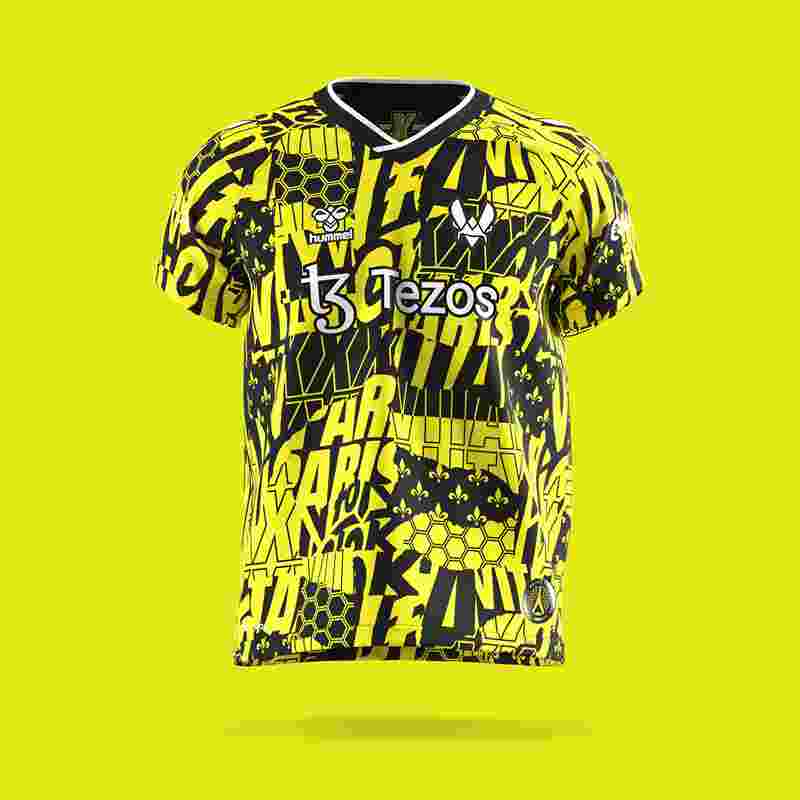 该件战袍定价为79.99欧元。T恤以黄黑为基调,融合了多种元素,包括Vitality字样、法国鸢尾花纹章、蜂巢图案等。下摆附近附有巴黎Major的标志。