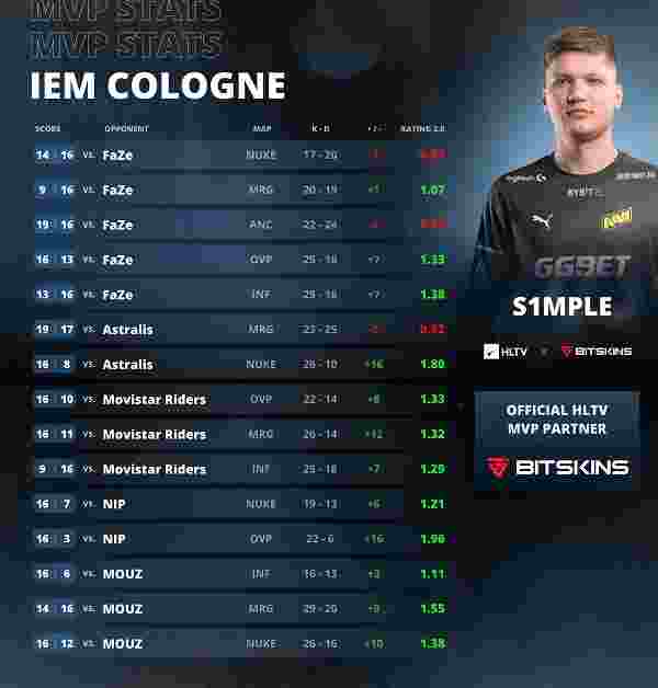 随着总决赛FaZe 3-2 击败NaVi,IEM科隆2022落下帷幕。HLTV也随之公布了本届赛事的MVP选手,虽然s1mple与冠军失之交臂,但是他还是以出色的个人表现斩获MVP,同时他也是唯一一位获得过三届科隆赛事MVP的选手。