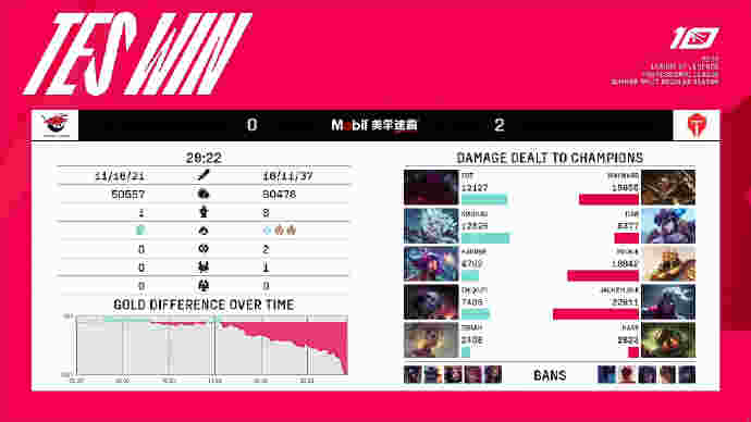 23分钟,小龙团战,Rookie沙皇推回来单人绕后的芮尔,韦鲁斯接上大招秒掉芮尔。TES拿到小龙,土龙魂听牌。28分钟,中路芮尔被韦鲁斯打残,奥恩大招被躲掉,芮尔残血向前一个空大。沙皇进场推回两人,TES一波0换4拆掉基地拿下比赛。