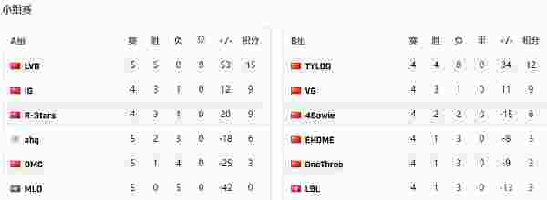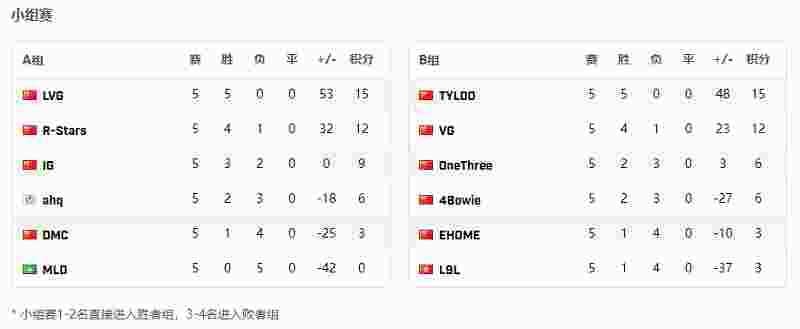 截止目前,WESG大中华区总决赛小组赛30场循环赛全部结束,A组中LVG五战全胜以小组头名出线,紧随其后的R-Stars也只输一场晋级到了淘汰赛胜者组;IG与ahq小组排名3、4名晋级淘汰赛败者组,DMC和MLD小组排名垫底被淘汰出局。另外B组中TYLOO携手VG直接晋级到了淘汰赛阶段,而OneThree和4Bowie位列3、4名将在明天迎来败者组的比赛,EHOME则是爆冷只胜一场,与L9L一起告别了本届WESG。