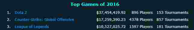 从2016年开始CS:GO的年度奖金超越LoL,成为年度奖金池第二高的游戏