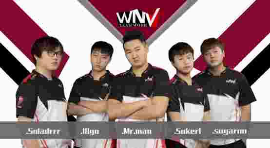夺冠阵容(左起):wNv.sakula(吴润波) wNv.44'alex(卞正伟) wNv.Jungle(杨克非) wNv.tk(马性驹) wNv.mikk(蒲江)