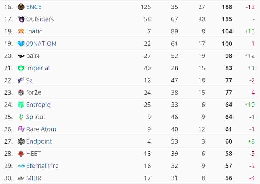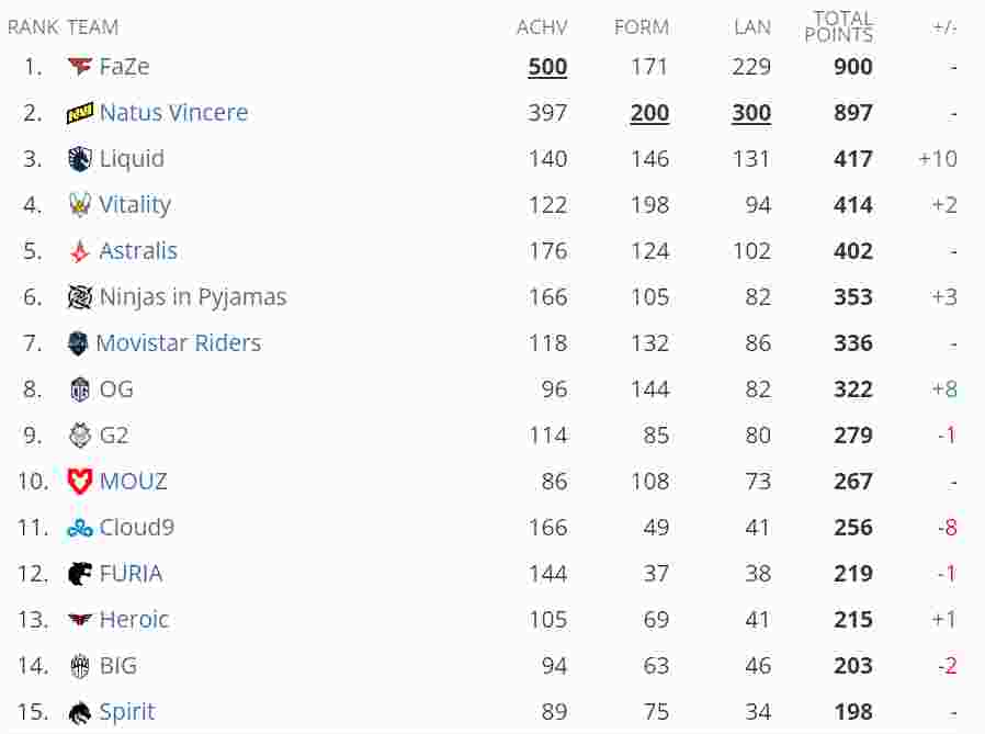 PGL 安特卫普 Major和IEM 达拉斯在本月从“线上比赛”的积分权重的去除,加之多支队伍进行了变阵,大量排名变动由此产生。