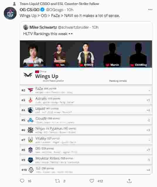 如今的Liquid达到了世界排名两年多以来的最高峰。他们上次来到这个排名还是2020年2月,2K和Twistzz尚在阵中。